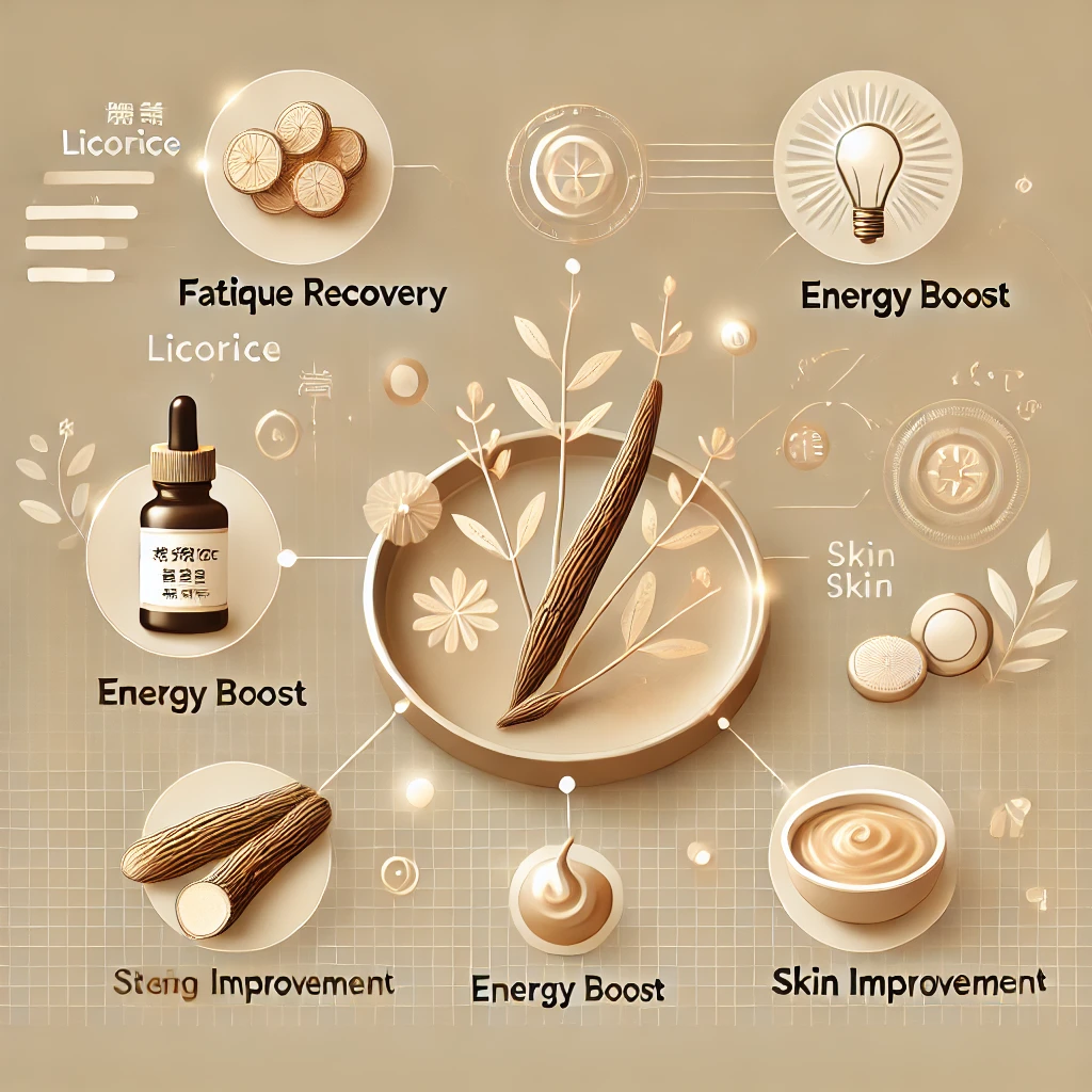 감초 추출물은 미백 성분으로도 사용되며, 기미와 잡티를 줄이는 데 도움을 줄 수 있습니다. 또한, 감초는 피부를 진정시키고 보습 효과를 높이는 데도 유용합니다.