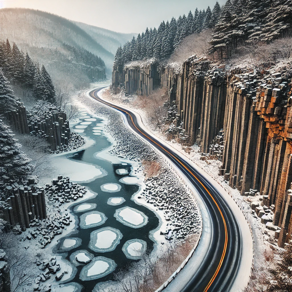 한탄강 주상절리길은 겨울이면 강이 얼어붙어 환상적인 풍경을 연출하는 곳으로, 아름다운 드라이브 코스로 추천됩니다.