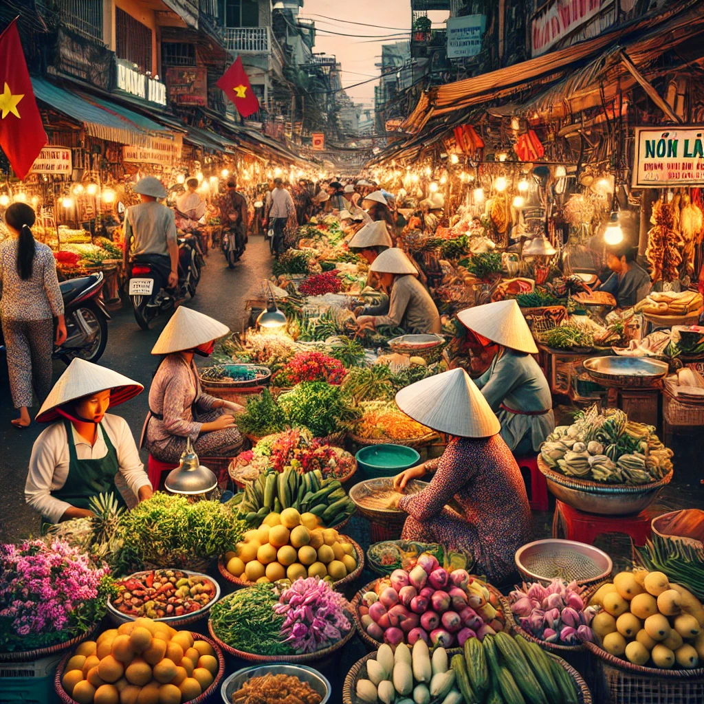 베트남의 길거리 시장은 현지의 삶과 문화를 가장 생생하게 느낄 수 있는 곳입니다. 아침부터 늦은 밤까지 활기 넘치는 시장에서는 신선한 과일, 채소, 꽃, 그리고 다양한 길거리 음식이 가득합니다. 현지인들은 전통 모자인 ‘논 라(Non La)’를 쓰고 분주히 움직이며 손님을 맞이합니다. 모터바이크 소리와 활기찬 대화 소리가 어우러지며 진정한 베트남의 분위기를 자아냅니다.
