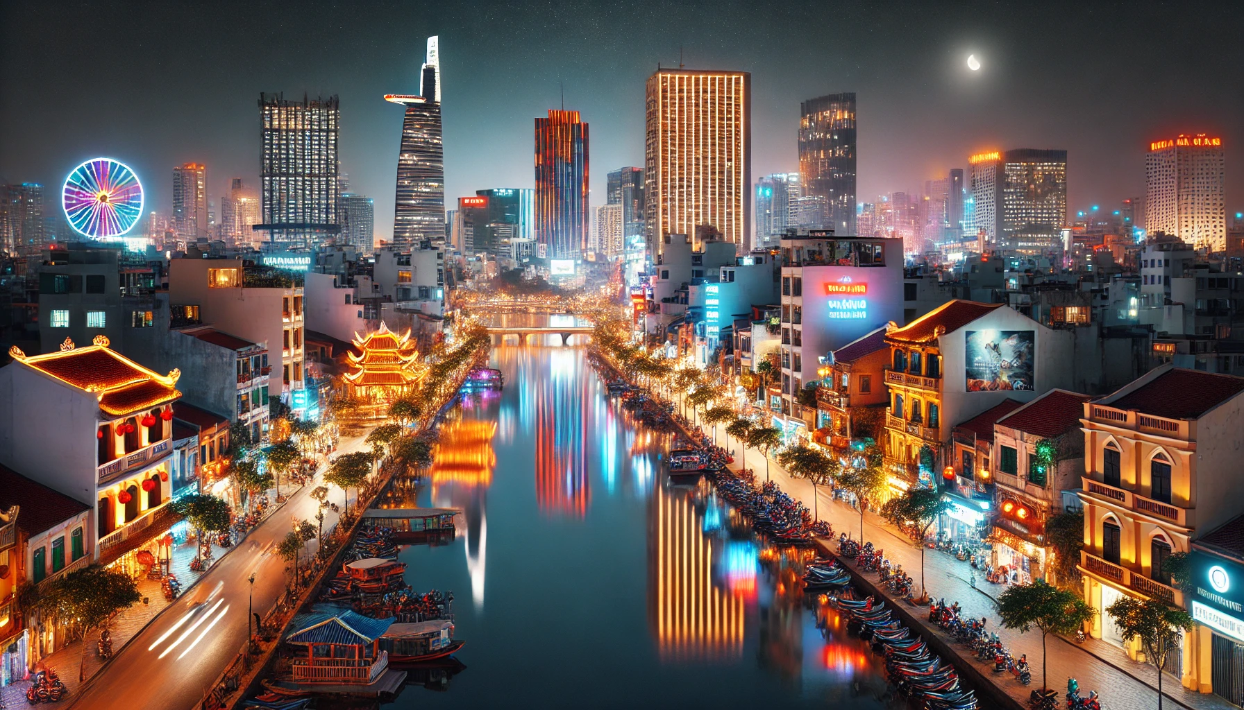 위의 사진은 베트남의 야경을 담은 대표적인 장면입니다. 고층 빌딩의 화려한 불빛, 거리의 오토바이 불빛, 그리고 전통적인 건축물이 어우러진 모습이 인상적입니다.
