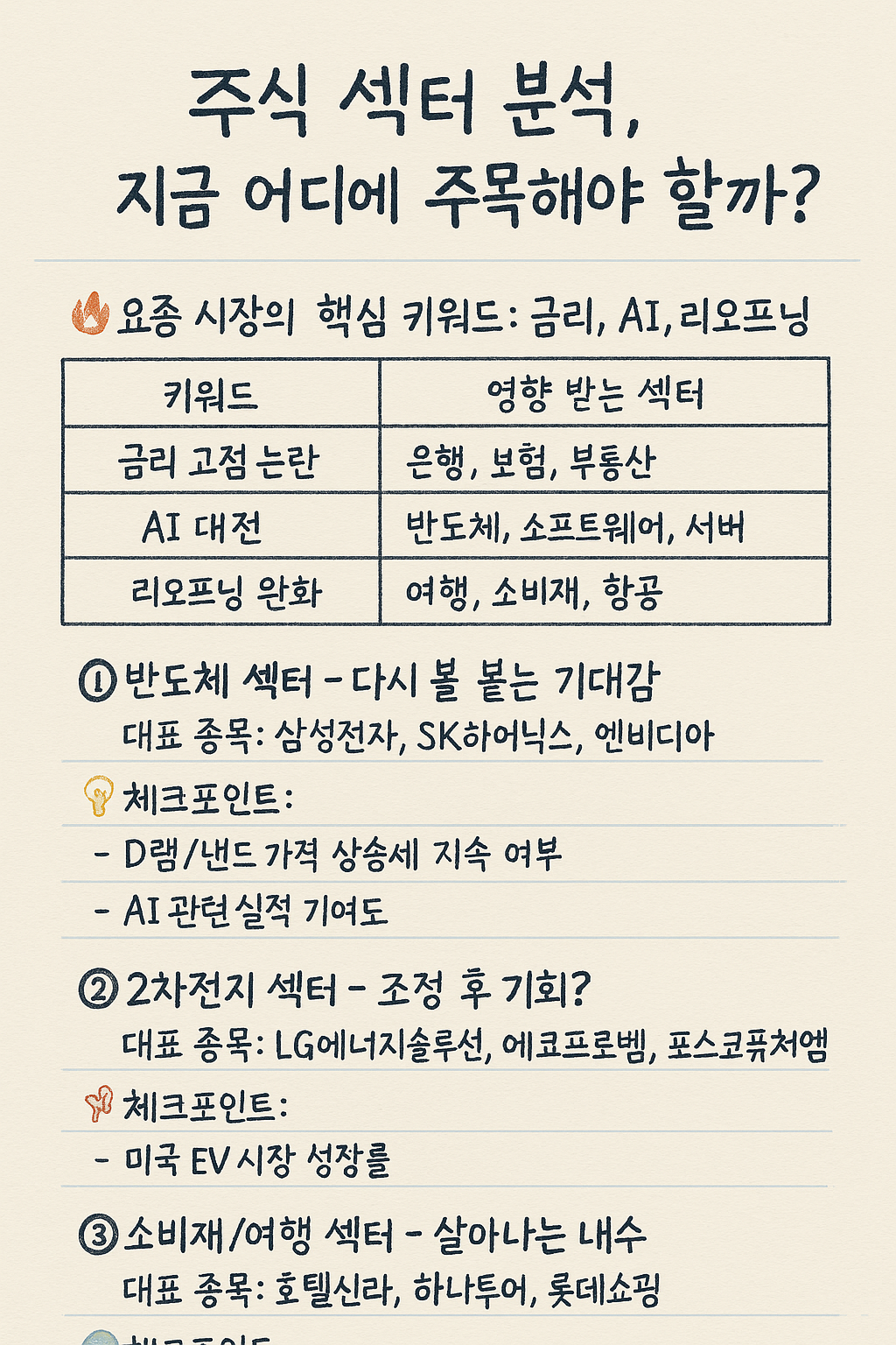 지금은 단순 테마가 아니라 실적 기반의 옥석 가리기 장세입니다. 큰 흐름은 AI와 반도체 쪽으로 이동 중이지만, 중장기적으론 2차전지나 소비재도 다시 기회를 줄 수 있어요. 결국 핵심은 **“지속 가능한 성장”**에 투자하는 것이겠죠.