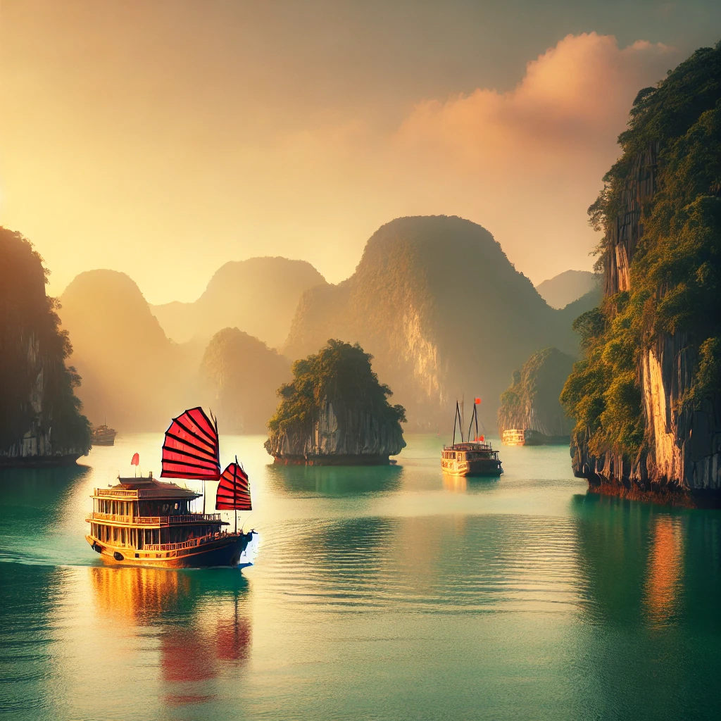 전통적인 목선(정크 보트)을 타고 하롱베이의 절경을 감상할 수 있습니다. 해질녘 붉게 물든 석회암 기둥 사이를 누비며 마시는 칵테일 한 잔은 그야말로 인생의 낭만을 느끼게 합니다. 🌅
