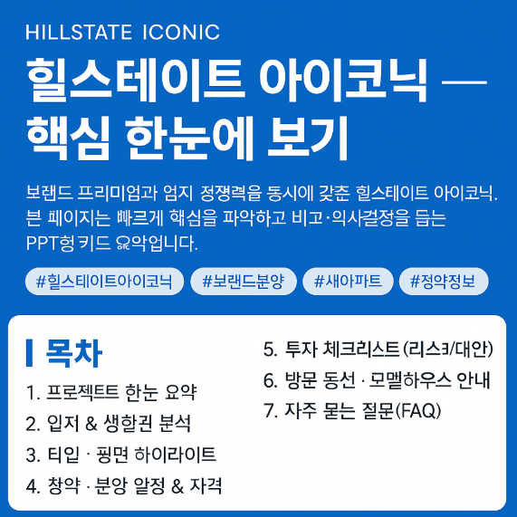 ※ 본 문서는 힐스테이트 아이코닉 정보를 빠르게 정리한 가이드입니다. 최종 조건·일정·분양가·타입 구성 등은 공식 자료로 재확인 바랍니다.